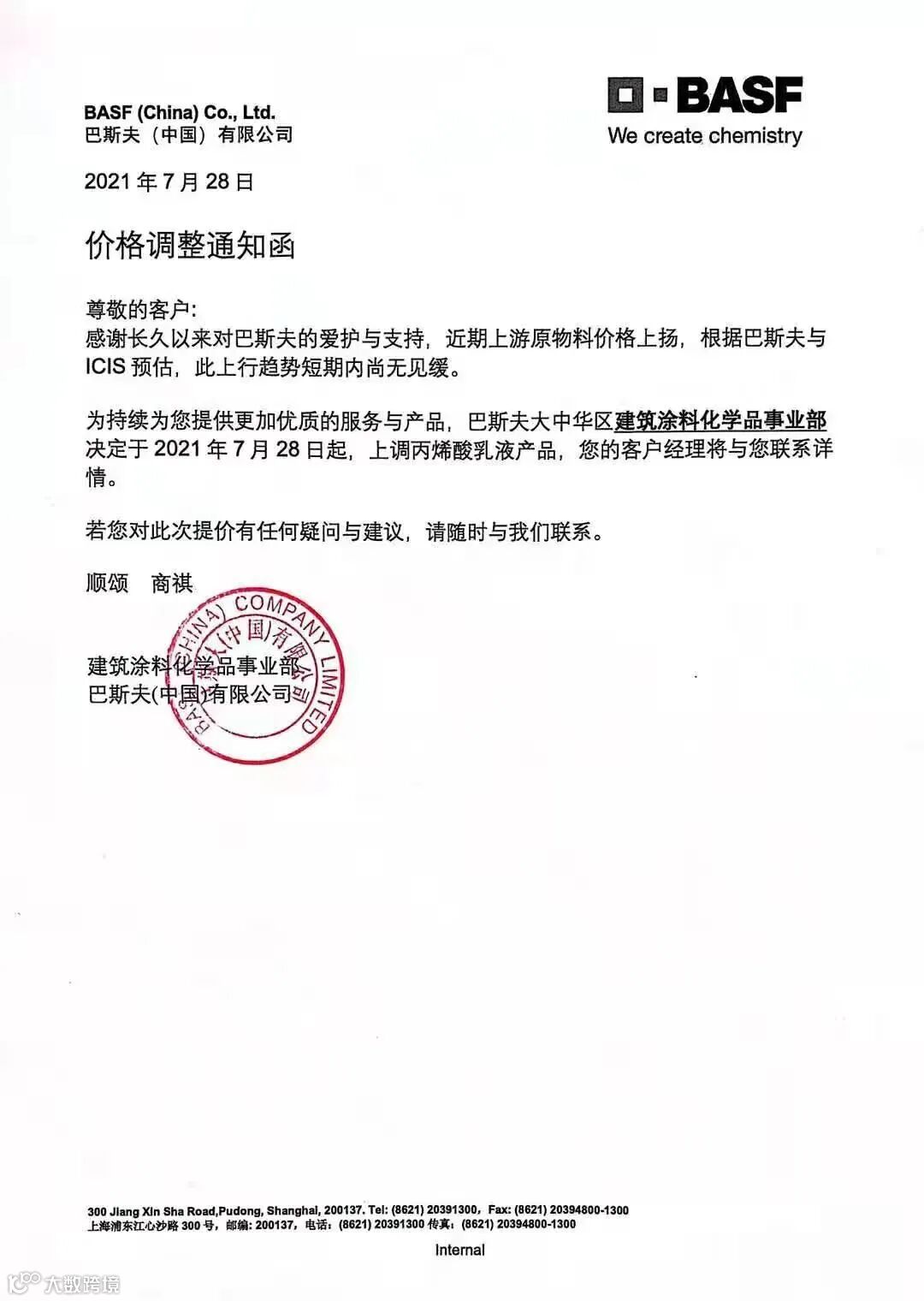 ▶ 同日,巴斯夫也将提高大中华区的丙烯酸乳液产品价格。由于近期上游原物料价格上扬,根据巴斯夫与ICIS预估,此趋势短期尚未见缓。为了能持续提供更加优质的服务与产品,巴斯夫大中华区建筑涂料化学品事业部决定,自即日起,上调丙烯酸乳液产品价格。