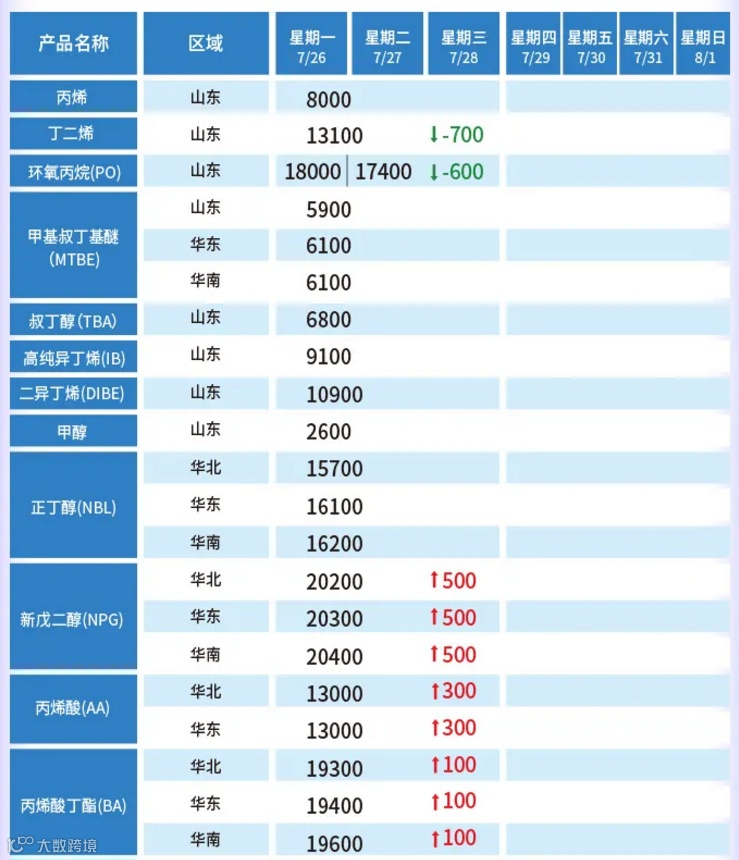 ▶ 7月28日,广东花果山环保科技有限公司发函称,自7月29日起,水性丙烯酸乳液上调500-1000元/吨;水性丙烯酸分散体上调1000-1500元/吨。