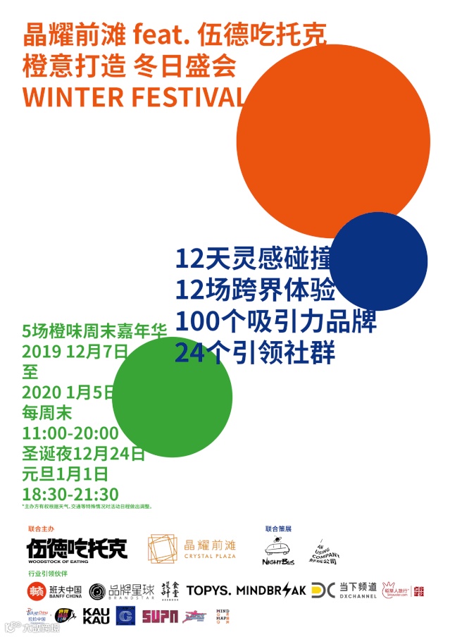 “橙色冬日盛会WINTER FESTIVAL”是上海文化高地前滩区域的首个美食潮流大型生活节。城市嘉年华品牌伍德吃托克,与上海青年新锐文化机构夜游巴士,及百余青年和生活方式独立品牌呈现。