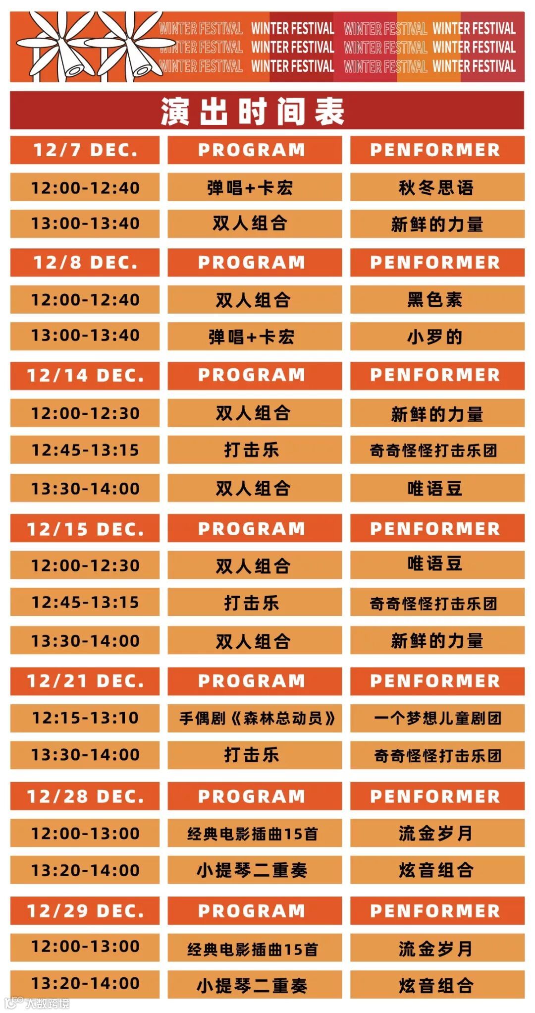 多时段暖冬、舞台演出惊喜不断,生动的即兴表演、欢快的非洲鼓演奏,还有独立乐队的弹唱加载,为橙色冬日盛会带来氛围极佳的视听派对!本周六即将开始!