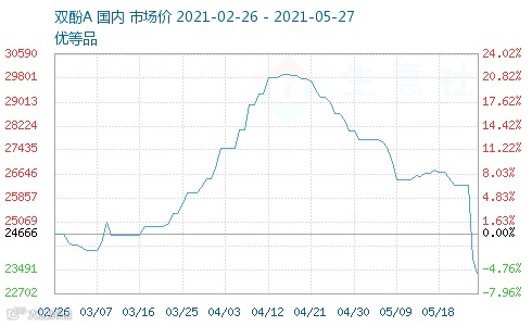 双酚A市场低迷,价格走势像是过山车直线下降,跌破今年以来最低点!自4月26日至5月16日,一个月时间内,双酚A从28640元/吨,下跌到23360元/吨,月跌5280元/吨!