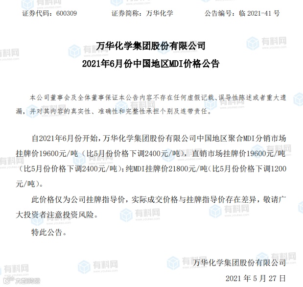 5月26日晚间,万华化学也发布2021年6月份中国地区MDI价格公告。自2021年6月份开始,万华化学中国地区聚合MDI分销市场挂牌价19600元/吨(比5月份价格下调2400元/吨),直销市场挂牌价19600元/吨(比5月份价格下调2400元/吨);纯MDI挂牌价21800元/吨(比5月份价格下调1200元/吨)。