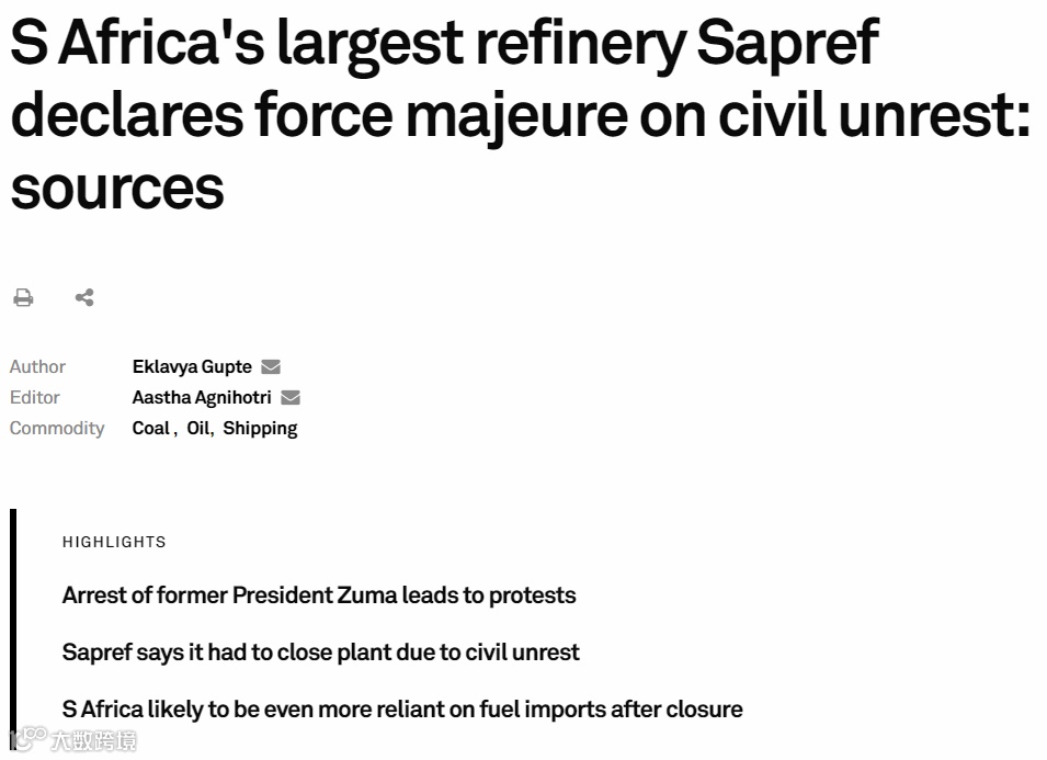 该厂在7月13日给客户的一封信中表示,该公司不得不做出艰难的决定,关闭该厂并宣布不可抗力,原因是“由于国内出现暴动,瓜祖鲁那他省(Kwazulu-Natal,祖马家乡所在)的进出路线受到干扰,Sapref关键原料供应商告知,运输车辆遭损毁、职员安全堪忧,因此会暂停交货。”