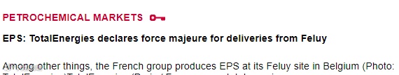 ▶▶ TotalEnergis(道达尔能源)宣布其在比利时的费卢依的EPS工厂宣布不可抗力!
