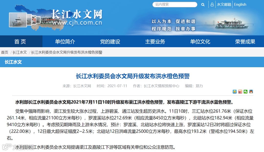 ▶▶ 水利部长江水利委员会水文局2021年7月11日10时升级发布渠江洪水橙色预警,发布嘉陵江下游干流洪水蓝色预警。另外,据水利部预测分析,今年汛期黄河中游可能发生较大洪水,目前黄河已进入防汛关键期。