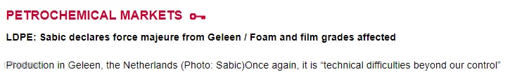 ▶▶ SABIC宣布其在荷兰林堡省的LDPE装置由于技术问题导致不可抗力。据悉,该地区年生产能力为57万吨LDPE和32万吨HDPE。