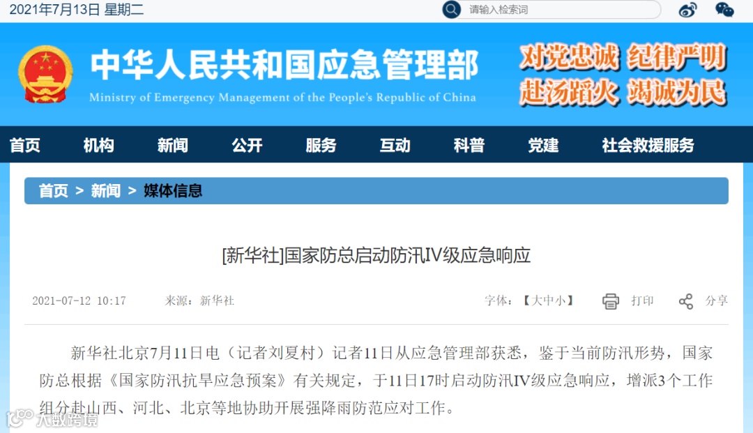 ▶▶ 国家防总根据《国家防汛抗旱应急预案》有关规定,于7月11日17时启动防汛IV级应急响应,增派3个工作组分赴山西、河北、北京等地协助开展强降雨防范应对工作。