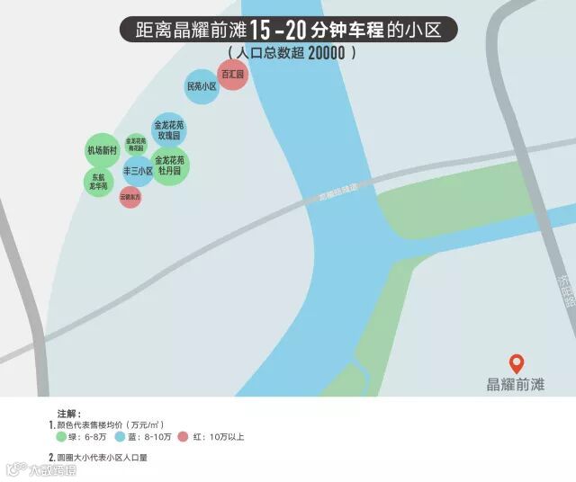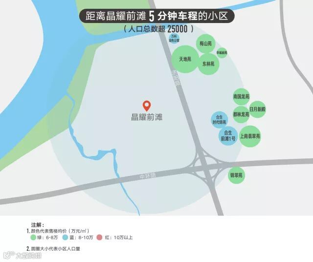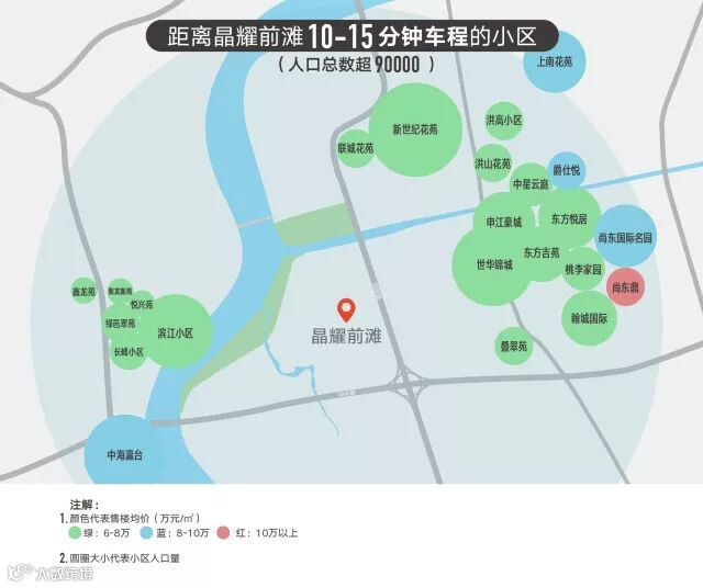 ▲再看远一点,距离晶耀前滩要15-20分钟车程的小区,可抵达黄浦江对岸的徐汇滨江区域,覆盖人口超25000人。包含了房价超过10万,上海知名的高端社区,百汇园、云锦东方等小区。
