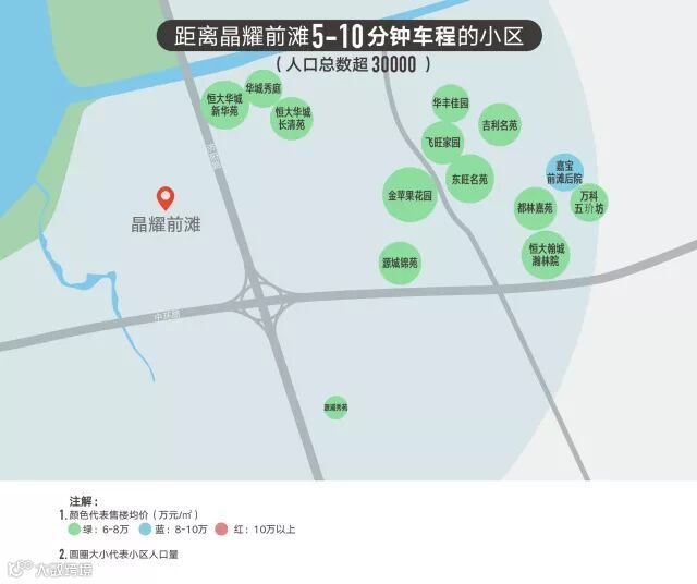 ▲而距离晶耀前滩约5-10分钟车程的小区,覆盖人口超30000人,项目以东片区密度惊人。值得一提的是,绝大多数小区属于新房源,比如2017年新开盘的嘉宝前滩后院。