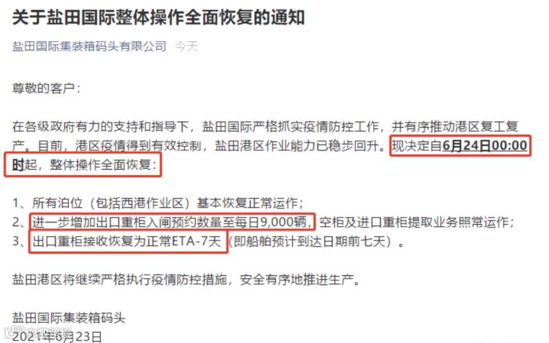 进出口外贸人终于松了一口气!6月23日,盐田国际集装箱码头发布通知,因盐田港区疫情得到有效控制,作业能力已稳步回升。自6月24日零时起,盐田港区整体操作全面恢复。
