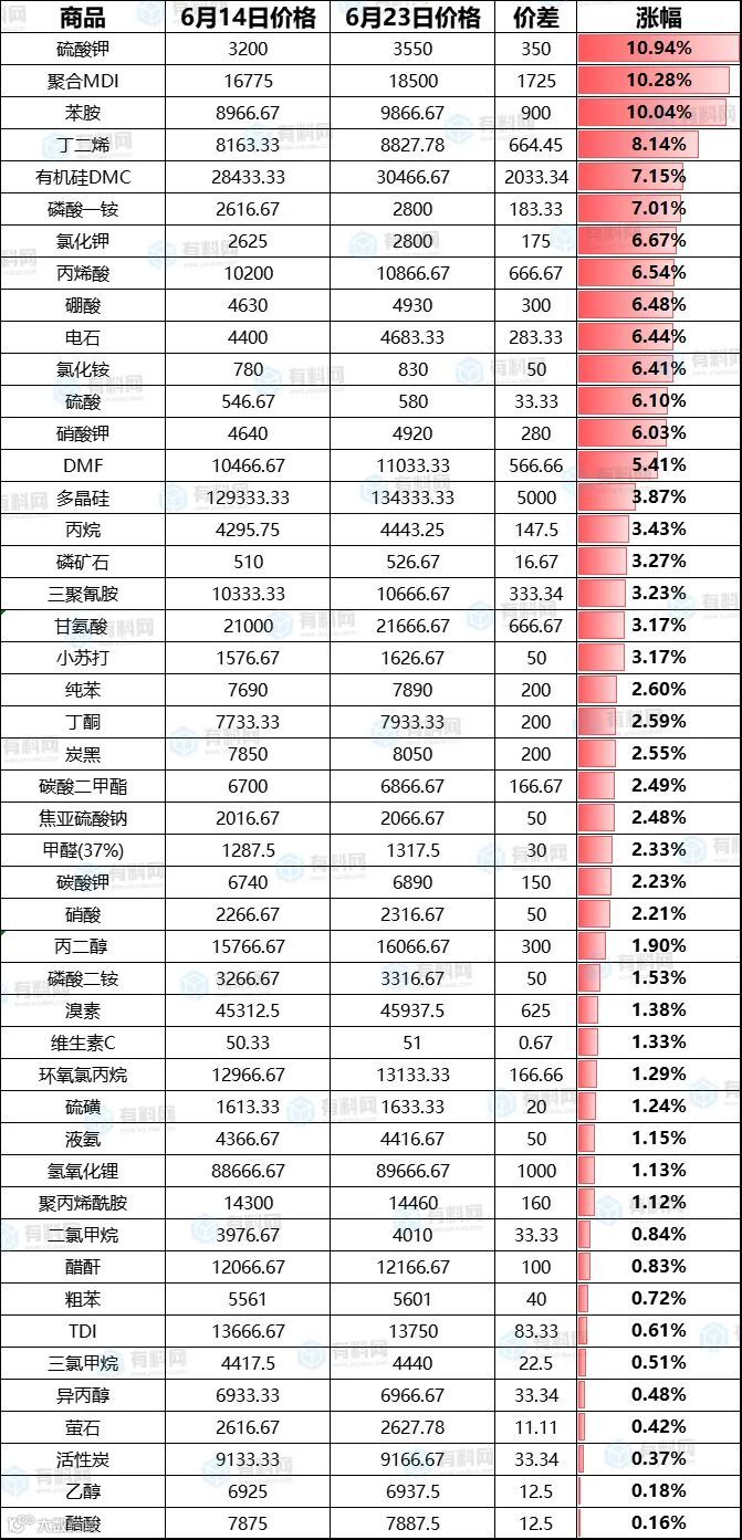 近一周部分原材料价格上涨情况