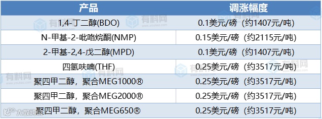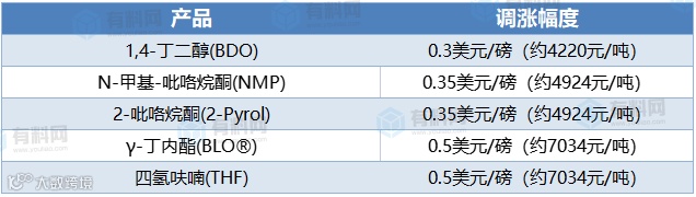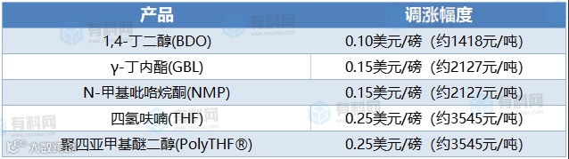 亚什兰自2021年7月1日或合同允许时间起,将提高北美地区1,4-丁二醇(BDO)和一些衍生产品的价格。涨幅如下: