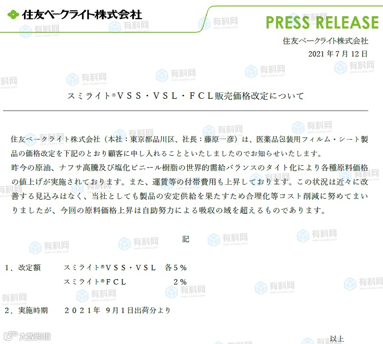 7月12日,住友电木株式会社公告称由于PVC供应短缺叠加海运成本不断攀升,公司将于9月1日起提高部分医疗包装薄膜的售价,涨幅在3%-5%之间。