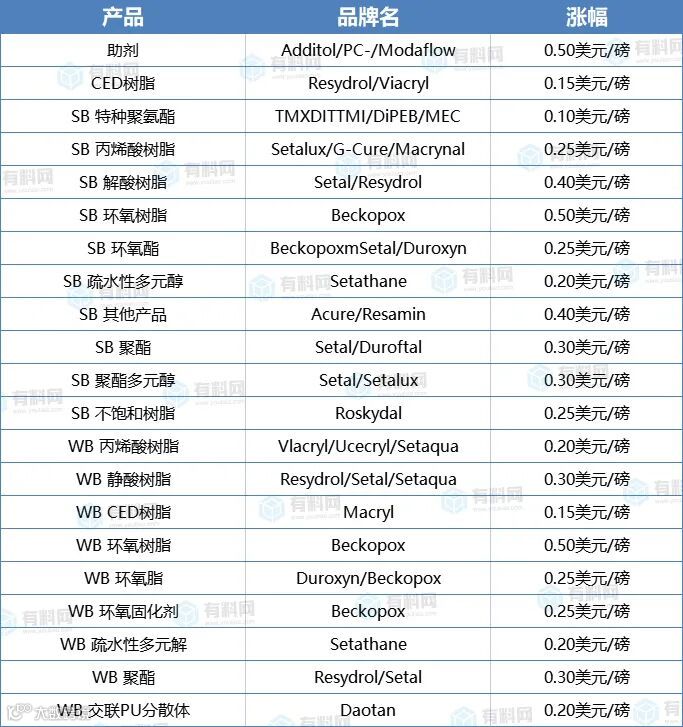 7月14日,Allnex湛新树脂再次宣布将于7月26日起上调公司聚氨酯树脂、环氧树脂、多元醇、聚酯等在内的22种树脂产品价格,涨幅最高达0.5美元/磅(约7050元/吨)。