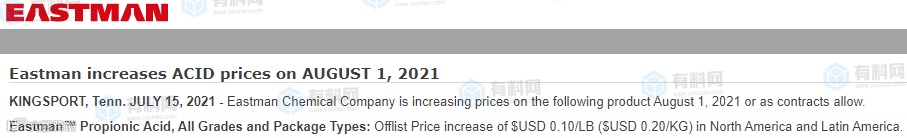 7月15日,伊士曼宣布8月1日起在北美和拉丁美洲地区的丙酸售价上调0.10美元/磅或0.20美元/千克(约1300元/吨)。