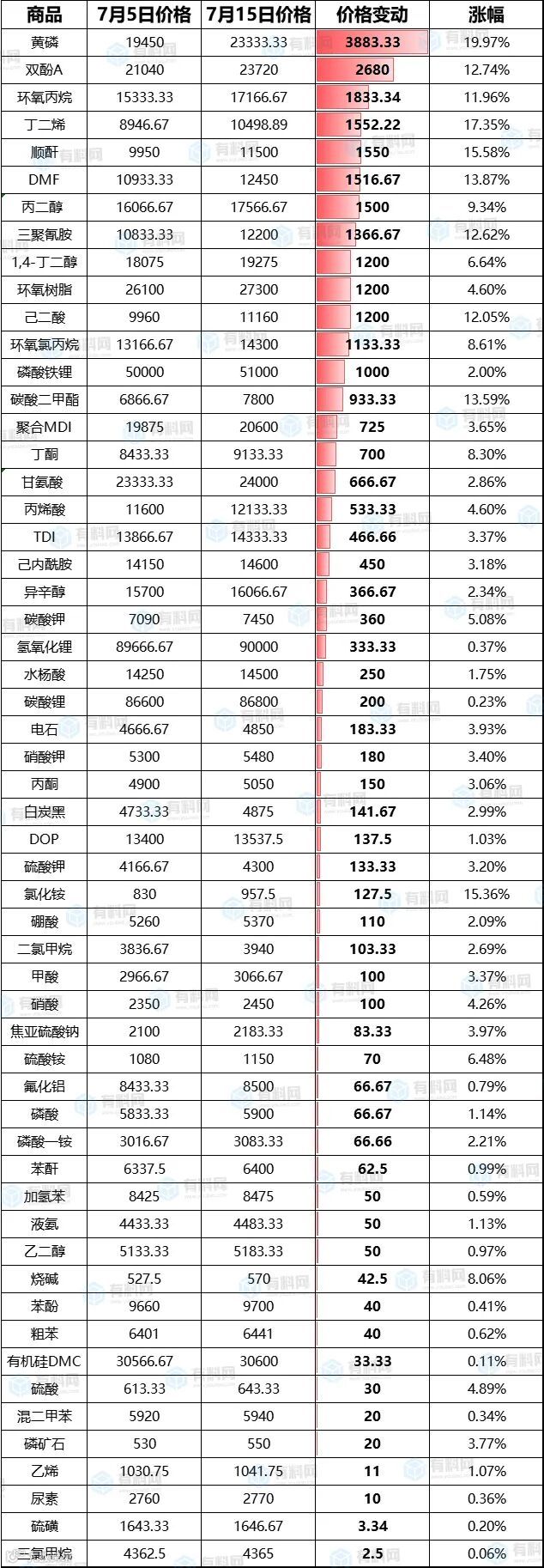 而在国外化工龙头企业的带领下,国内化工品市场再现火爆之势,丁二烯日涨1600元/吨,丙二醇日涨1133元/吨,碳酸二甲酯日涨1134元/吨,近百种化工原料火速跟涨,一周的时间上涨超过1000元/吨,气氛火爆异常。