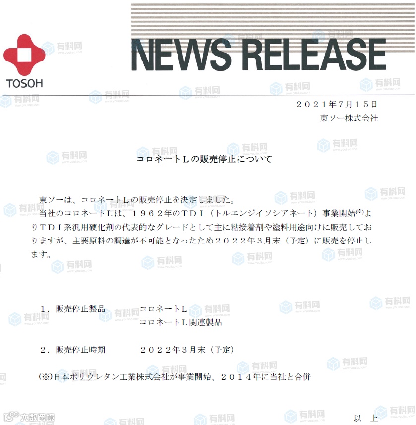 7月15日,日本主要TDI供应商日本东曹TOSOH(原NPU)宣布因为主要原料难以供应,公司拟定于2022年3月末全面终止TDI(品牌名:CORONATE)及其相关产品的销售业务。