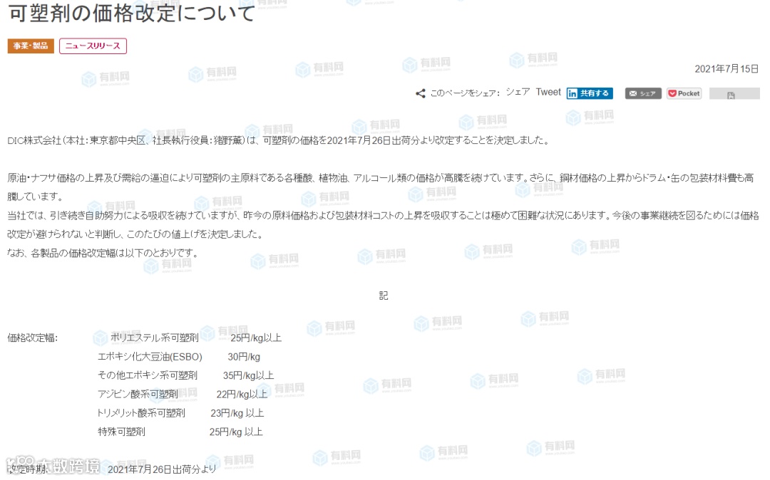 7月15日,DIC宣布将于7月26日,对公司增塑剂产品进行涨价,不同产品涨幅在22日元/千克-35日元/千克(约1295元/吨-2060元/吨)。