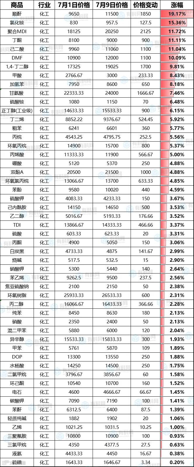 7月部分化工原材料价格变动表