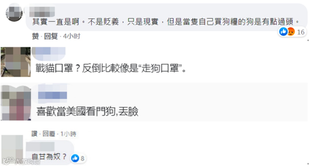 有网友讽刺:“其实一直都是(宠物狗)啊。不是贬义,只是现实,但是当只自己买狗粮的狗是有点过头。”“‘战猫’口罩?反倒比较像是‘走狗口罩’。”“喜欢当美国看门狗,丢脸。”↓