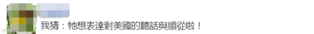 有网友说,“我猜,它想表达对美国的听话与顺从啦!”↓