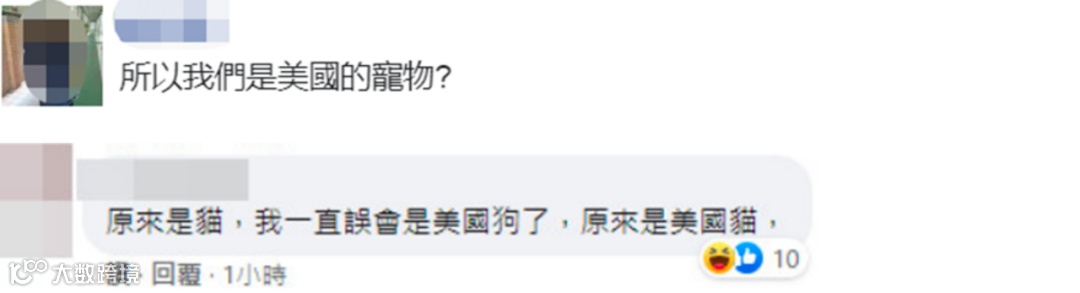 岛内网友也有同感。有人认为,美国、日本捐赠疫苗,适当表达感谢可以,但戴这种口罩模糊疫情焦点、作秀,真的太过头了。有网友问:“所以我们是美国的宠物?”也有网友说:“原来是猫,我一直误会是美国狗了。”↓