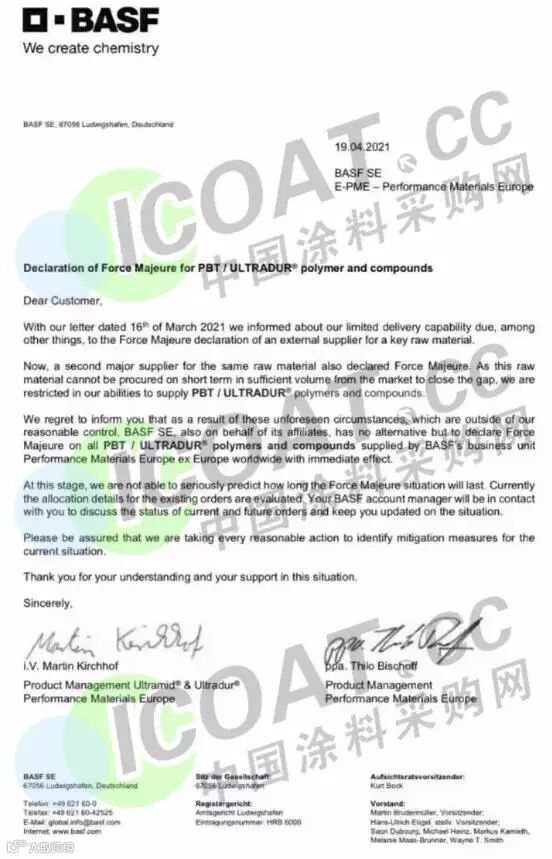 巴斯夫连发3份通知宣布遭遇不可抗力