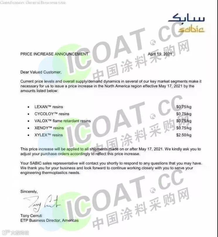 LEXAN™(PC)树脂 上涨0.75美元/千克。