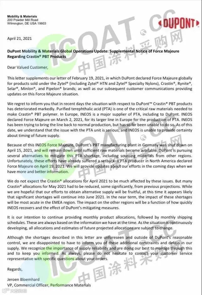 杜邦发布“有关Crastin PBT产品的不可抗力补充通知”:由于制造Crastin PBT聚合物所需的关键原料之一:精对苯二甲酸(PTA)的主要供应商INEOS(英力士)于2021年3月2日宣布了不可抗力后,截至目前都无法确定未来供货时间。