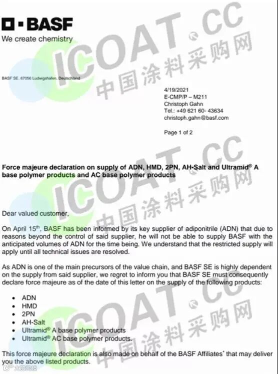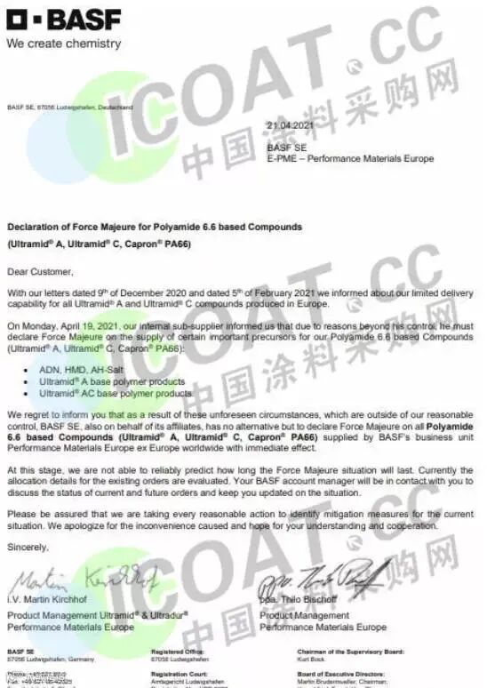 这直接影响了巴斯夫PA66产品(Ultramid® A 和 Ultramid®C , Capron®PA66)的供应。因此巴斯夫宣布所有PA66基产品遭遇不可抗力,立即生效。在现阶段,不可抗力持续时间还无法预测。