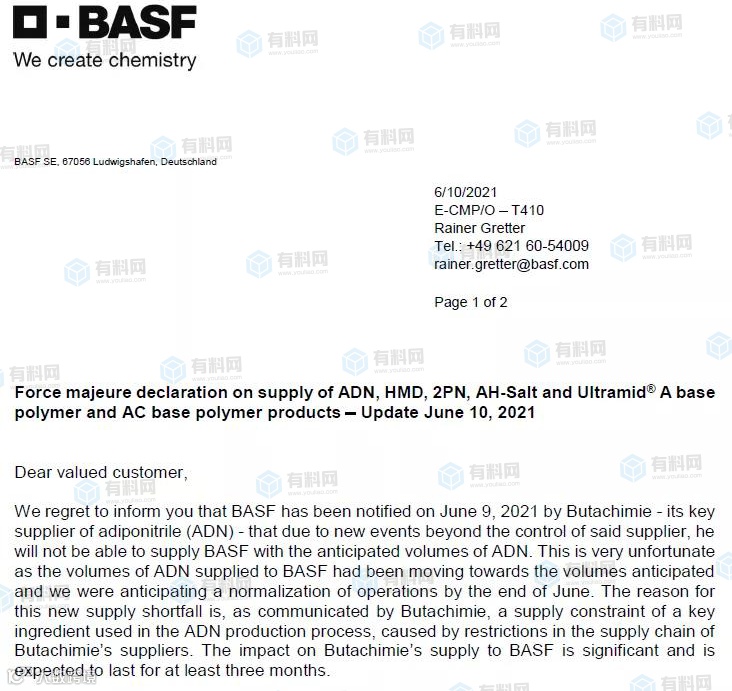 近日,巴斯夫己二腈(ADN)的主要供应商告知,由巴斯夫不可抗力持续,将无法为巴斯夫提供预期数量的己二腈(ADN)。同期不可抗力声明的还有的HMD、2PN、Ah盐(PA66盐)、Uitramid A and AC PA66产品。巴斯夫预计,该不可抗力的存在可能将比之前预计的时间更长,并预计供应分配至少维持到8月。随着该不可抗力事件的持续,预计对全球HDI供应链仍有一定程度的影响。