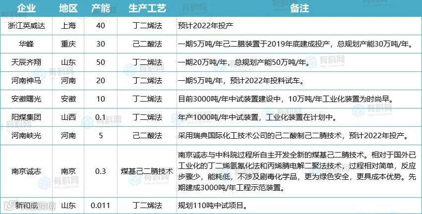 以往,国内的己二腈完全依赖进口。近年来,己二腈国产化迎来转机,内外资都在积极扩产。一方面,英威达在上海投建40万吨/年己二腈生产工厂;另一方面,天辰齐翔、华峰、神马等国内企业纷纷投建己二腈项目,国产己二腈产业化在即。