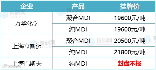 近日,万华化学和上海亨斯迈MDI报价与6月相同,但上海巴斯夫工厂纯MDI任务量完成,目前已经暂停接单,封盘不报。
