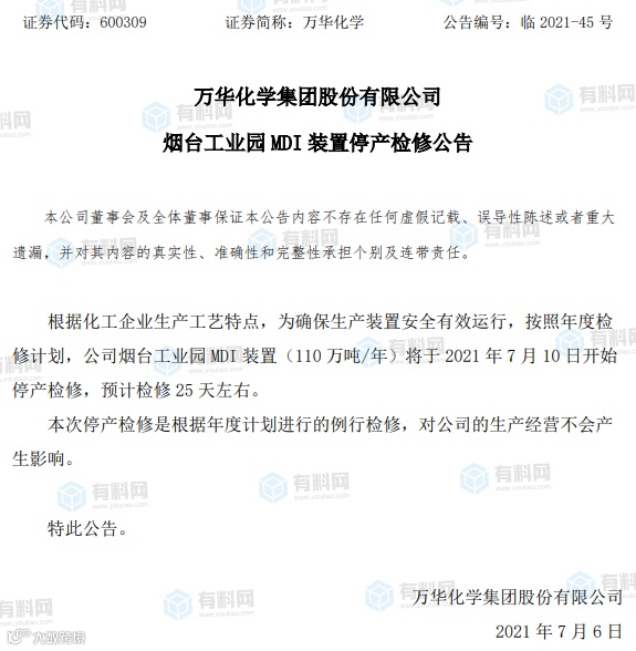 同样是7月5日,万华化学晚间公告,公司烟台工业园MDI装置(110万吨/年)将于7月10日开始停产检修,预计检修25天左右。