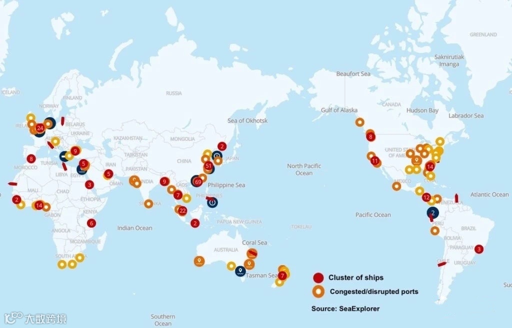 红色代表船只集群,橙色代表拥挤或运营中断的港口