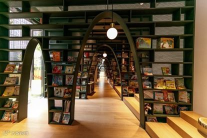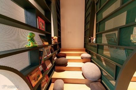 绿色拱形书架犹如座座向外延伸的镂空小山,把整个图书馆串联成一个怀抱知识的森林。我想无论是家长还是孩子,都可以在这放置软垫的台阶上小坐,尽情享受真正的阅读时光。