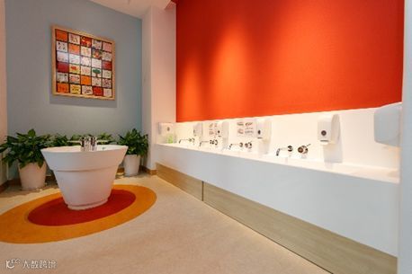 干净整洁的洗手池,没有采用感应系统,而是以按压式的洗手液和手动款的水龙头取而代之,因为这些都是嘉宝希望孩子慢慢掌握的能力。同时,小朋友们在洗手的过程中不知不觉地养成健康的生活习惯,锻炼生活自理能力。