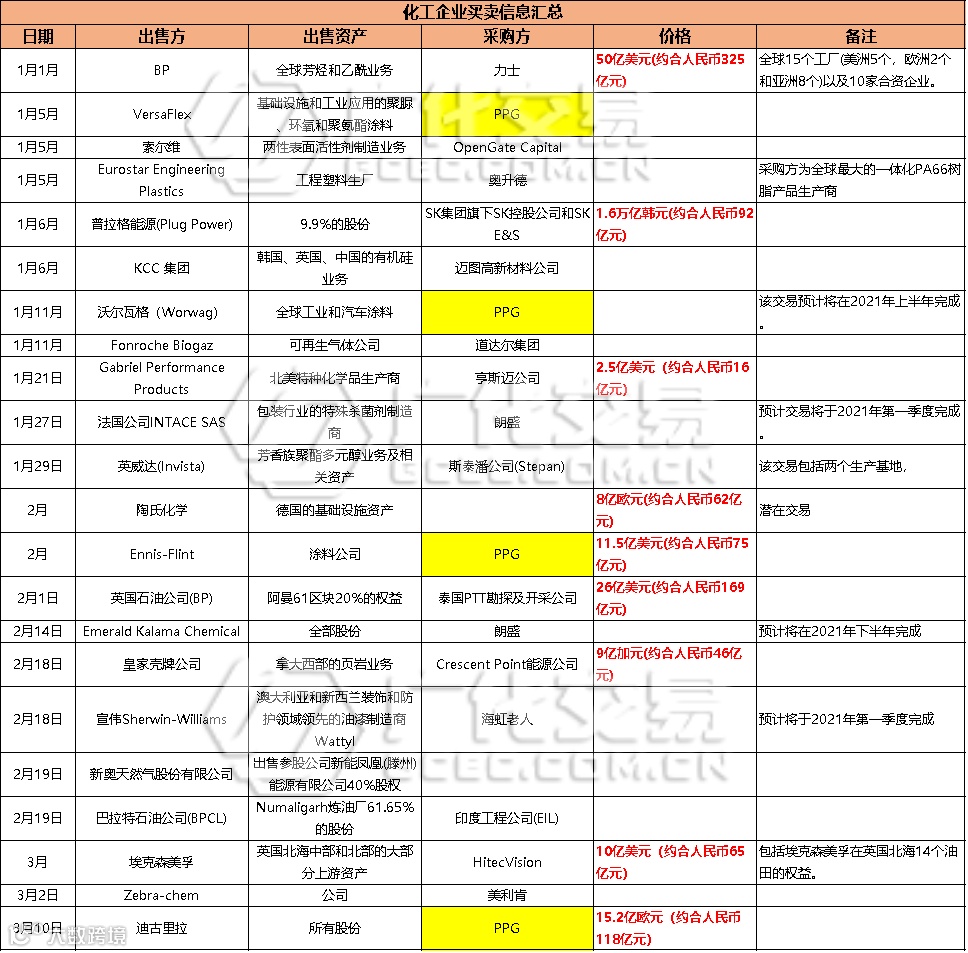 据不完全统计,目前已经有超过20家化企出售公司所有的业务、是所有股权甚至是整个公司打包出售无条件转让,其中不乏陶氏、英国石油、埃克森美孚等国际巨头。
