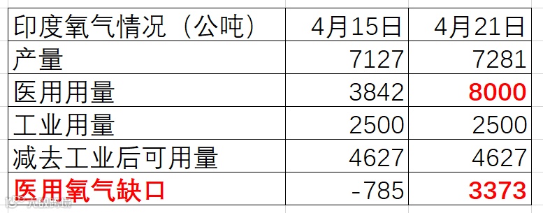 现在印度医用氧气每日需要8000公吨,每天的上限产量是7127公吨,差额是870公吨。