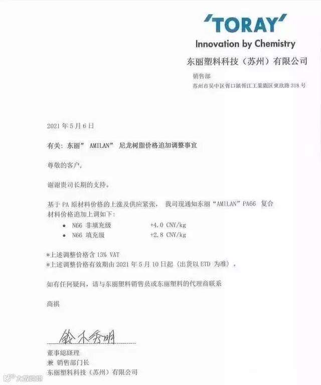 东丽宣布在此前AMILAN尼龙树脂涨价的基础上,再次追加上涨。此次价格调涨将于5月10日生效。