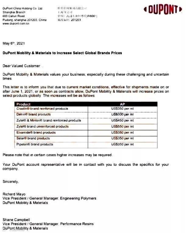 杜邦发布涨价函,称基于目前的市场条件,自6月1日起,或在合同允许的条件下,将在全球范围内调涨部分产品的价格,调涨价格在300-550美元/吨附近(约合人民币1943-3563元/吨)。