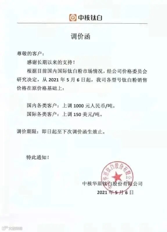屡创近年价格新高的钛白粉仍在涨价之路上狂飙,日前山东东佳、江苏镇钛、恒通钛业、山东道恩、金浦钛业、中核钛白等多家钛白粉龙头企业陆续发函调涨,宣布国内最高调涨1000元/吨,外贸销售最高调涨150美元/吨。