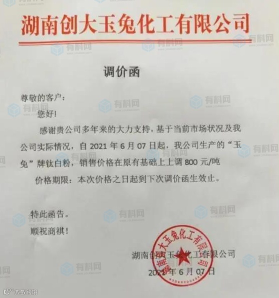 而早在6月7日,湖南创大玉兔发布调价函称即日起,公司生产的“玉兔”牌钛白粉在原价基础上上调800元/吨。