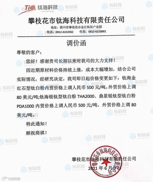 6月9号,攀枝花钛海科技发布调价函称:即日起,我司钛海金红石型钛白粉、钛海锐钛型钛白粉THA2000、鼎星锐钛型钛白粉 PDA1000 内贸价格上调500元/吨,外贸价格上调80美元/吨(约520元/吨)。