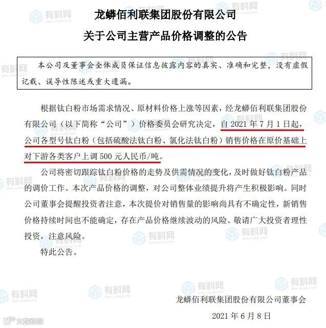 6月8日,龙蟒佰利发布钛白粉调价函通知称,自7月1日起,公司各型号钛白粉(包括硫酸法钛白粉、氯化法钛白粉)在原价基础上上调500元/吨。