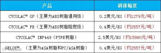 SABIC发布涨价函,7月5日起部分树脂产品价格上调,涨幅如下: