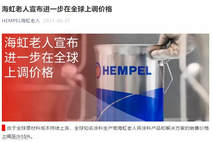 海虹老人:将涂料产品和解决方案的销售价格上调至少15%。