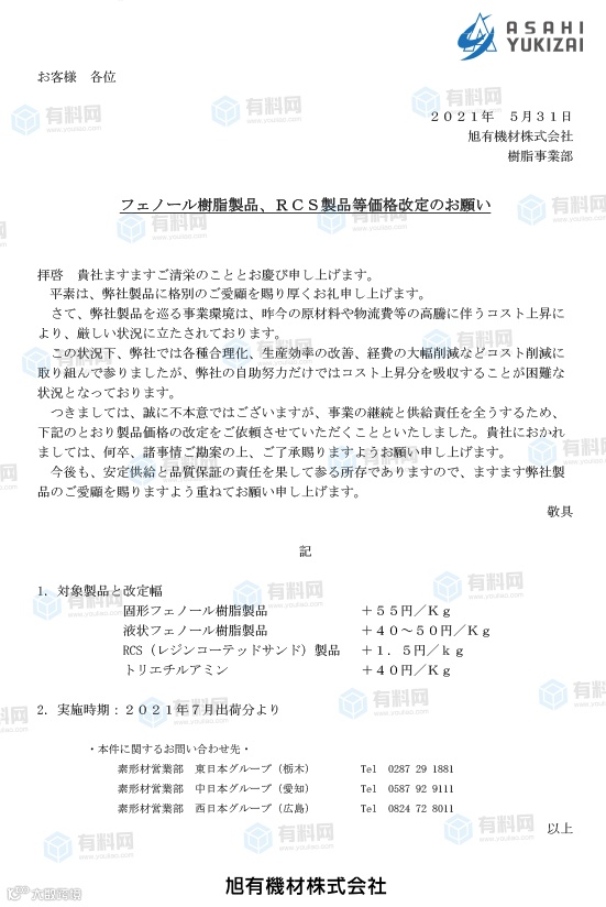 旭有机材株式会社:7月1日起调涨酚醛树脂产品价格,涨幅如下: