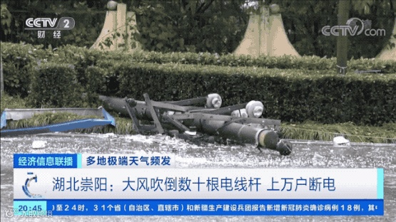 湖北崇阳县,暴雨、大风、冰雹等天气轮番上演,大风将城区几十根电线杆吹倒,导致3条线路1万余户停电。