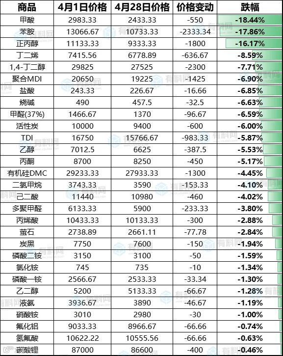 苯胺下跌2333.34元/吨,跌幅17.86%